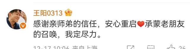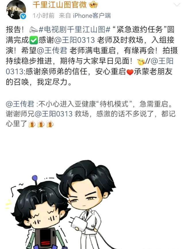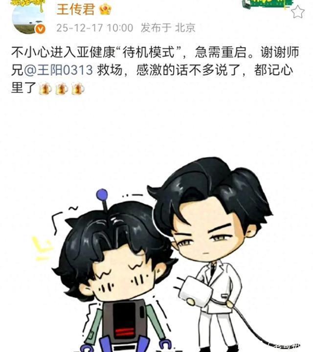 王传君的发文既说清了情况,又弱化了突发退出的负面感,完全没提具体病情或剧组矛盾,尽显体面。 更绝的是后续衔接,6分钟后王阳就转发回应,一句“安心重启”精准呼应师弟的说法,还强调是“承蒙亲师弟信任、老朋友召唤”,既点出了同门情谊,也说明了救场的来龙去脉。